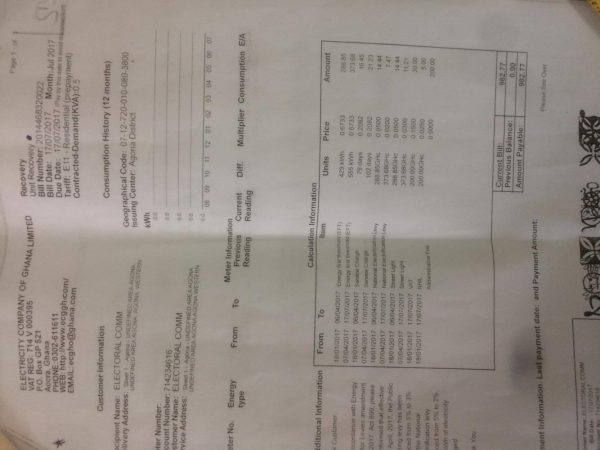 www.233times.net checks at ECG head office in Takoradi revealed that the bill that was given to the EC was a unit recovery bill that gives the election organizers the details of their arrears of electricity so they could request for the bill which will have their logo on it.