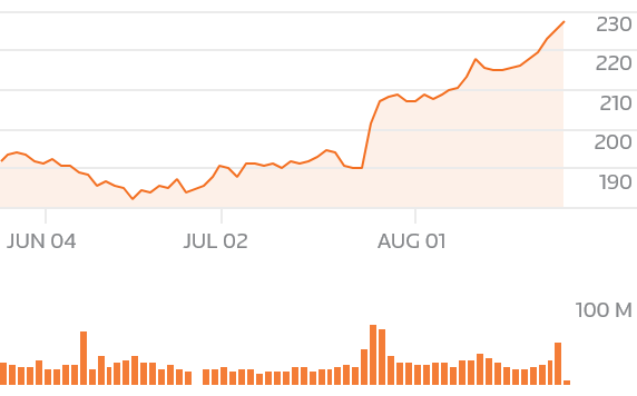 Apple shares were up 2.2 percent at an all-time high of $227.97.