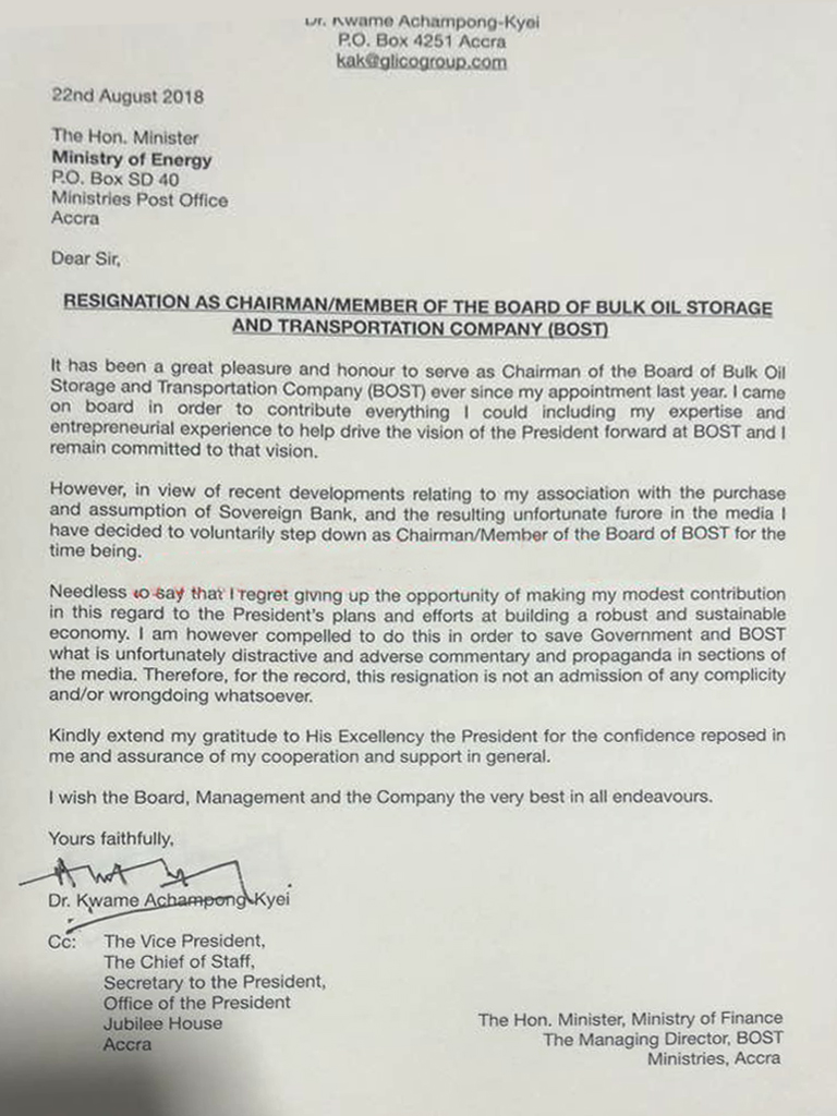 The board Chairman of the Bulk Oil Storage and Transportation Company (BOST) Kwame Acheampong Kyei has resigned over the collapse of Sovereign Bank.
