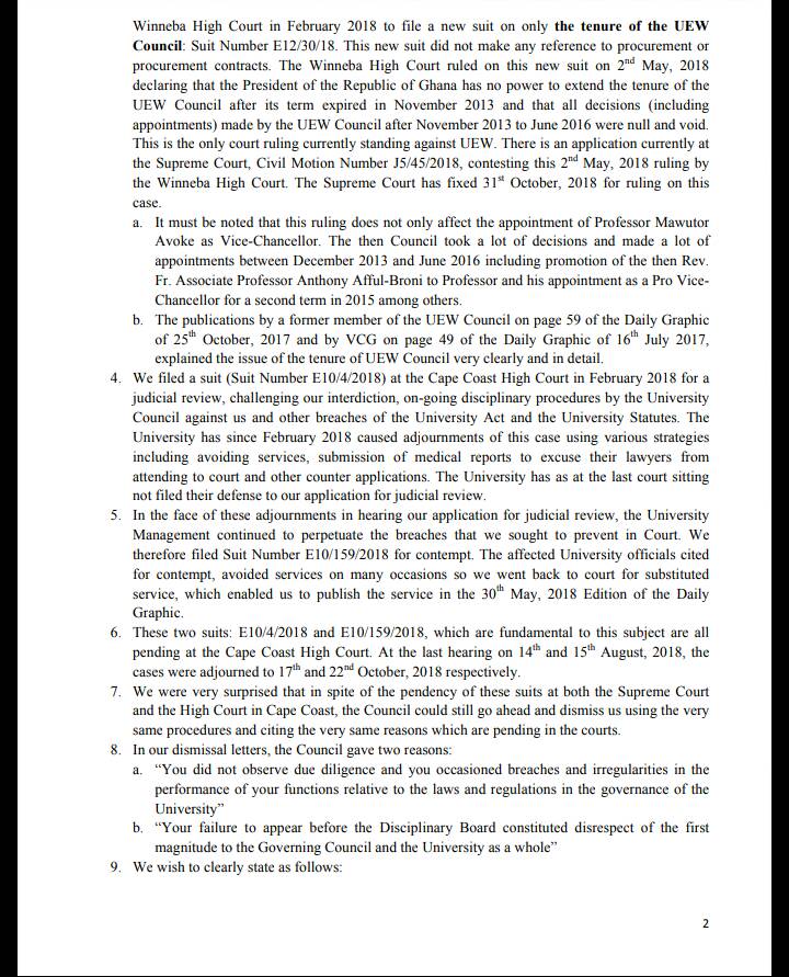 “…Because proper procedures were not followed, the matter is in court. The contract that they are talking about – The North campus road contract was not awarded by Prof. Avorke. That contract was even awarded when the current council Chairman was the Pro-Vice chancellor. The first phase of that project was done and he signed all the payment vouchers. The second phase was done in 2015 when the current acting Vice Chancellor was the Pro-Vice chancellor and the records are there.”