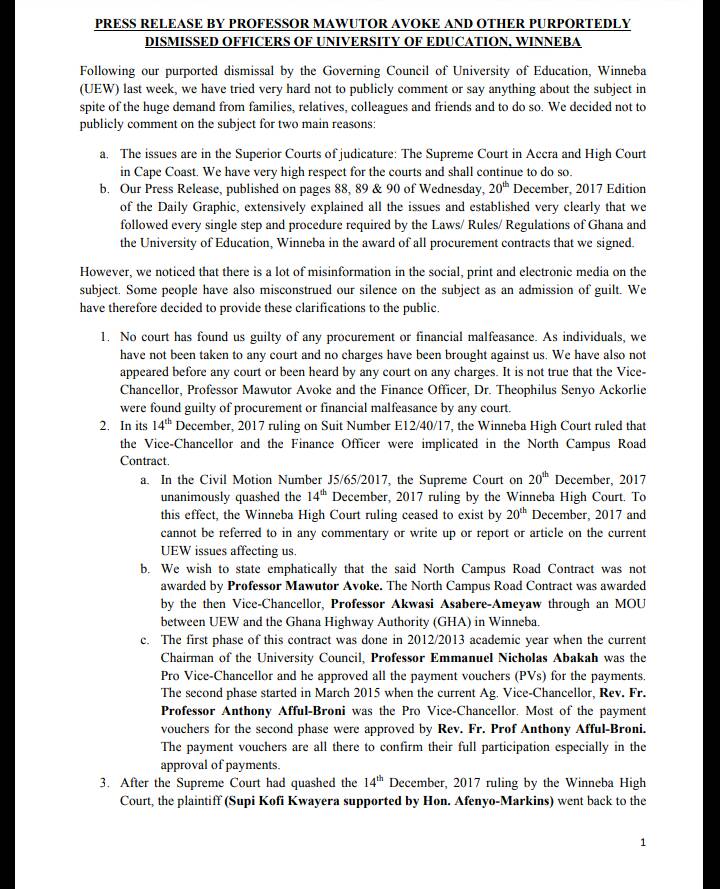 The five officials including the then Vice-Chancellor Professor Mawutor Avoke and the Finance Officer, Dr. Theophilus Senyo Ackorlie, were sacked for withholding some information the University Council deemed crucial in an on-going investigation over a contract awarded by the university.