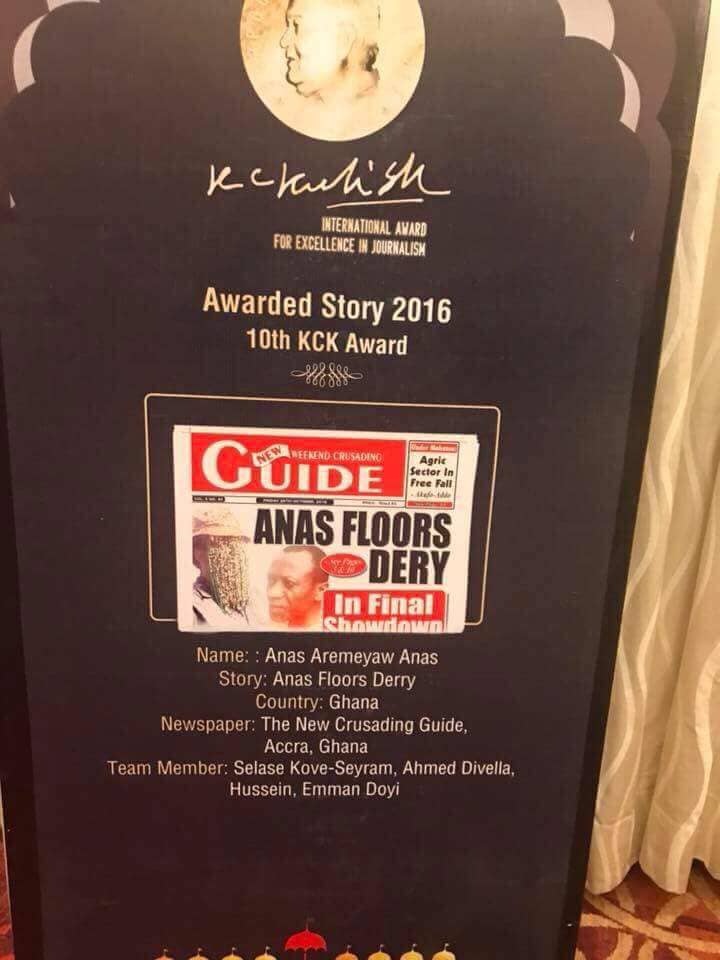 Award-winning journalist and lawyer Anas Aremeyaw Anas has been awarded the 2016 Excellence in Print Journalism at the 10th KCK Award for Excellence in Journalism.