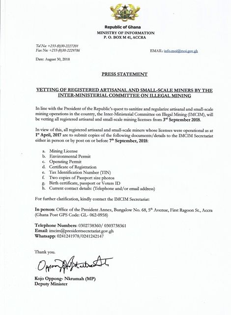 The Ministry of Information in an earlier statement directed all registered artisanal and small-scale miners whose licenses were operational as at April 1, 2017 to submit all relevant documentation to the Inter-Ministerial Committee on Illegal Mining (IMCIM) Secretariat by post or in person before Friday, September 7, 2018.