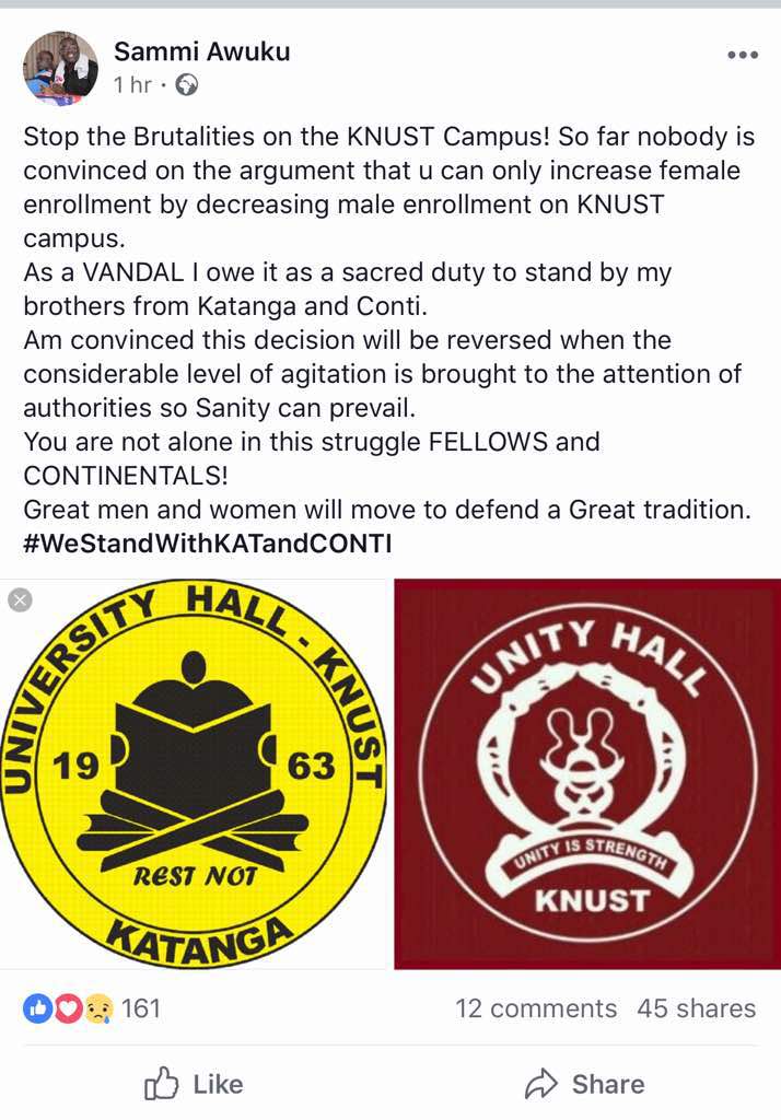 In a statement on Facebook, he said he was not convinced by the argument that “you can only increase female enrollment by decreasing male enrolment on KNUST campus.”