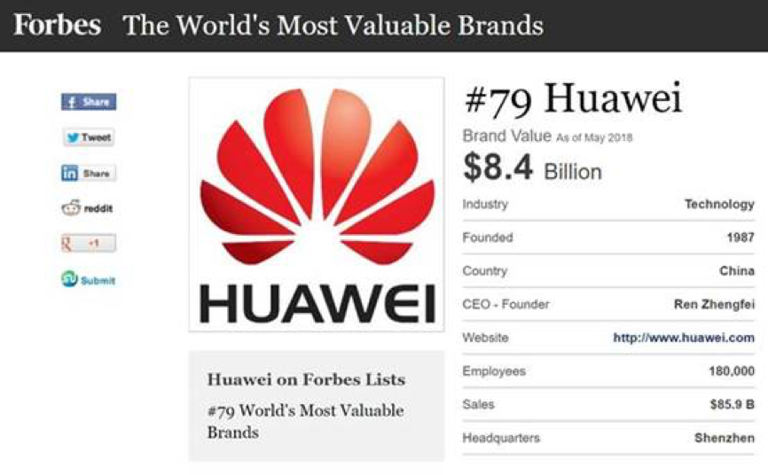 Huawei is the only Chinese company to feature in the annual ranking of the world’s Most Valuable Brands 2018 compiled by Forbes. Huawei has been included in the list for the second consecutive year ranking 79th with a brand value of US$8.4 billion.