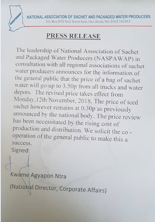 The National Association of Sachet and Packaged Water Producers (NASPAWAP) in consultation with all regional associations of sachet water producers has announced an increase in the bag of sachet water from Ghc3 to GHc3.50p.