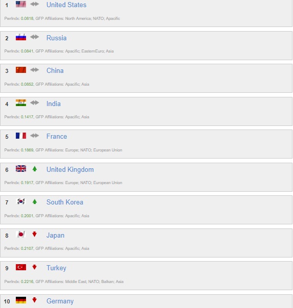 The GFP ranked the United States as the strongest army in the world, followed by Russia, China, India and France respectively.
