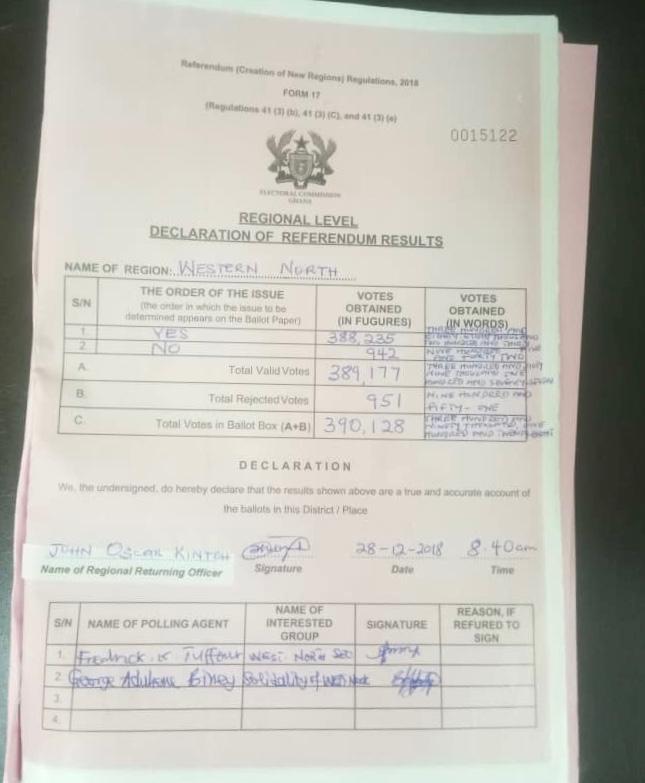 Graphic Online’s Dotsey Koblah Aklorbortu reports from the Western Region that, out of the 501,306 registered voters, a total of 388,235 voted YES representing 99.52 per cent, while 942 voted NO.