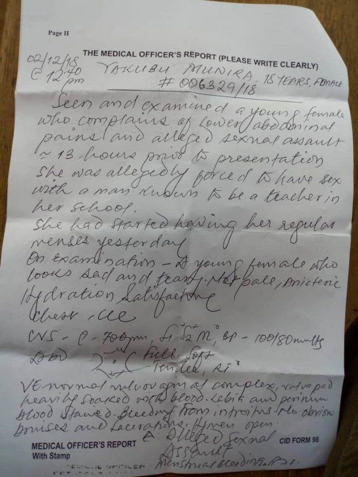 The victim has been discharged from the hospital awaiting a medical report after her father led a local search party to rescue her from the rented room of the teacher outside the school compound.