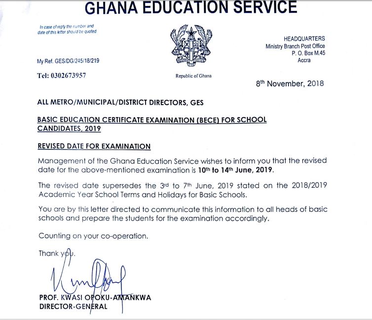 “Management of the Ghana Education Service wishes to inform you that the revised date for the above-mentioned examination is the 10th to 14th June 2019.”
