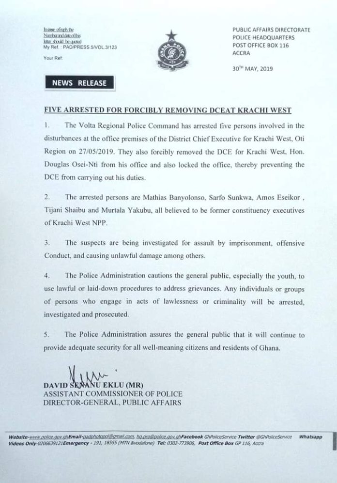 Police in the Volta region have arrested five persons for forcibly removing the Krachi West DCE from office on Tuesday.