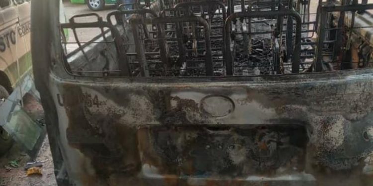 Numbering about 10, these armed men beat up a driver and attacked about four buses, setting one completely ablaze and one partially ablaze.