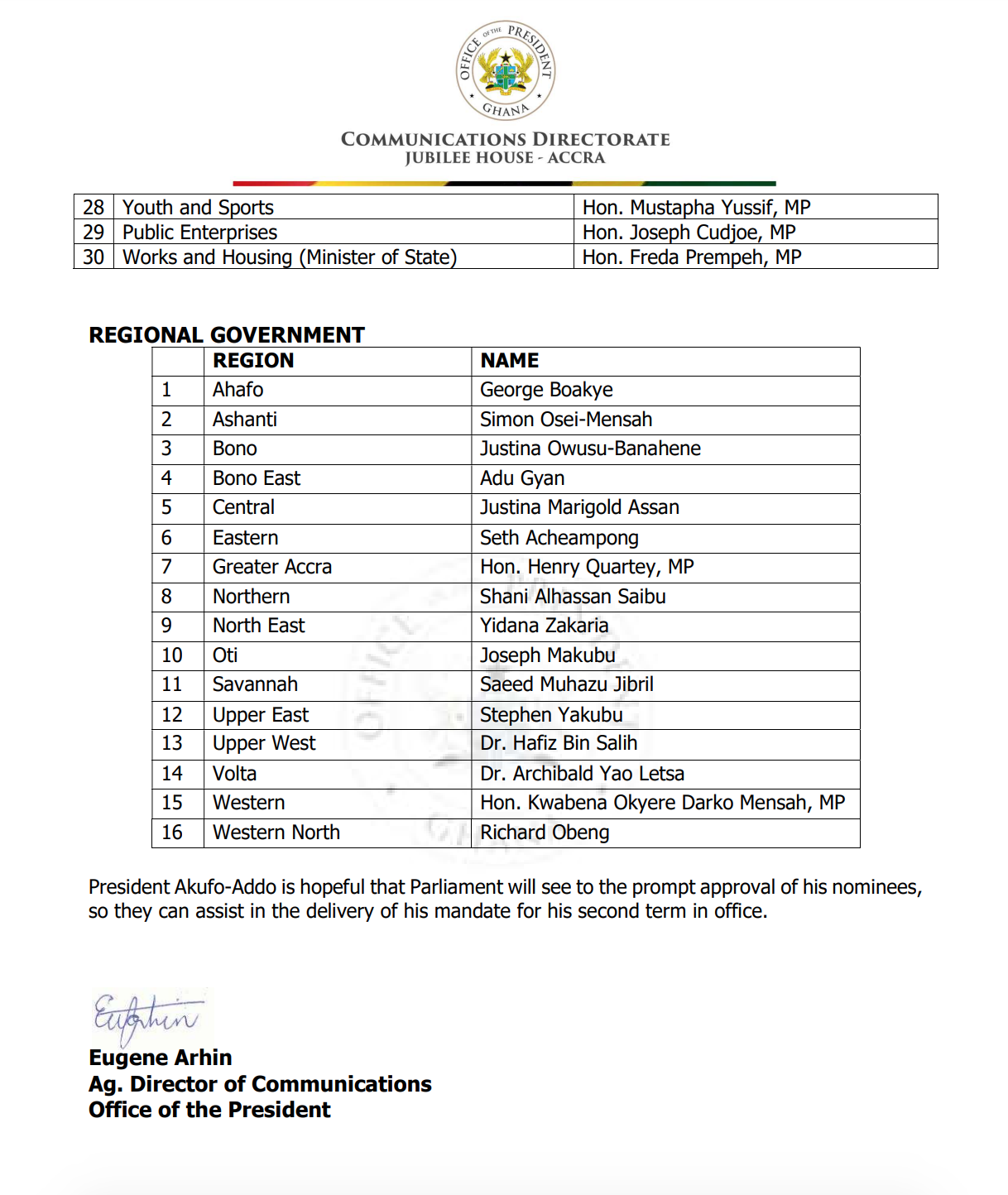In all, President Akufo-Addo has appointed 30 Ministers, and 16 Regional Ministers, bringing the total number of ministers to 46.