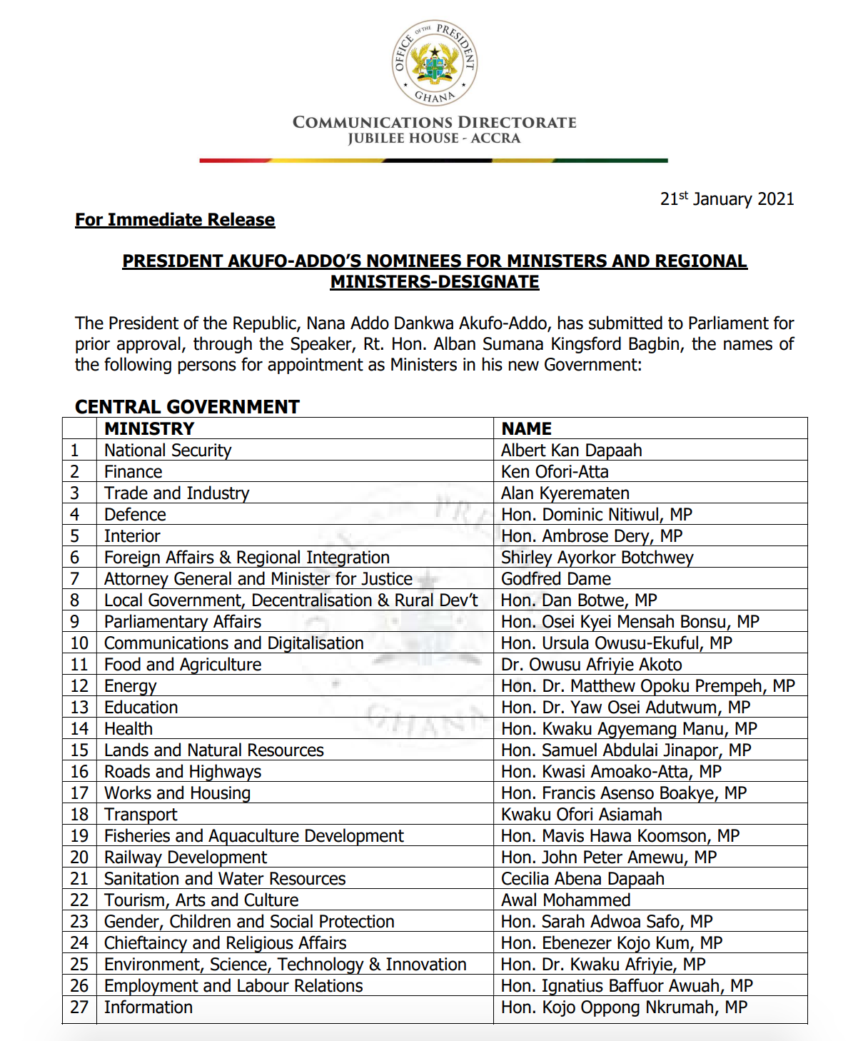 The presidency released the full list of ministerial appointments for the next government in a statement on Thursday, January 21, 2021.