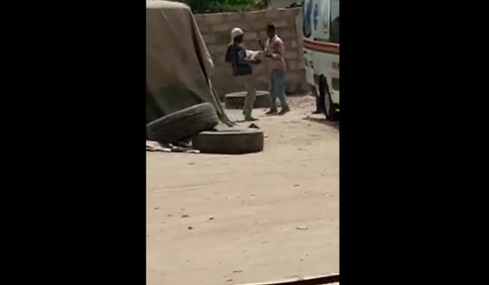 In the video, two men, believed to be workers at a cement shop, were captured busily packing them into the ambulance.