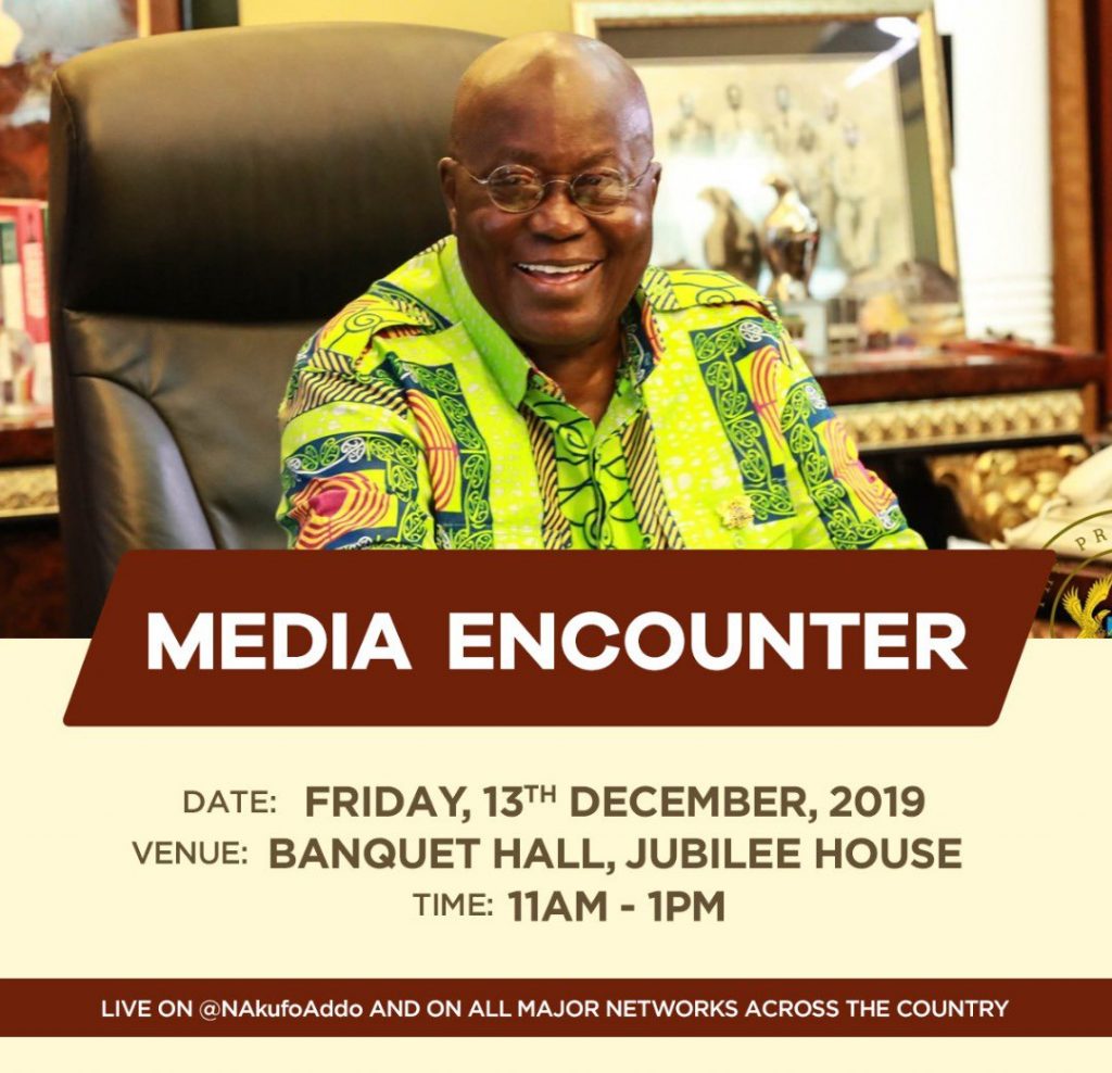 President Nana Akufo-Addo will on Friday, December 13, 2019, meet members of the press at the Jubilee House. The encounter is expected to afford invited journalists the opportunity to ask the President some critical questions on topical issues in the … Read more →